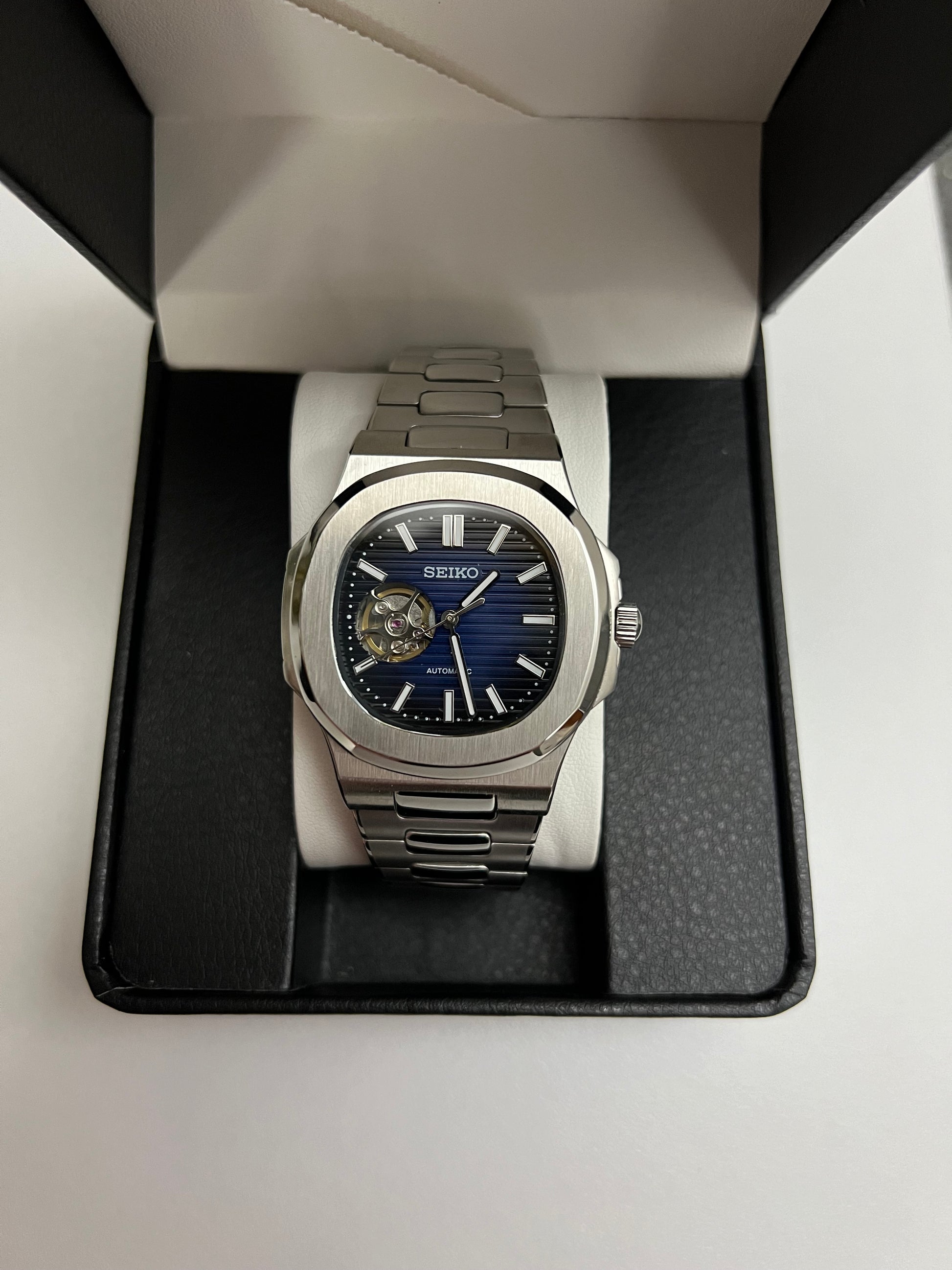 - Dial: Blue Open Heart Nautilus Inspired Custom Dial